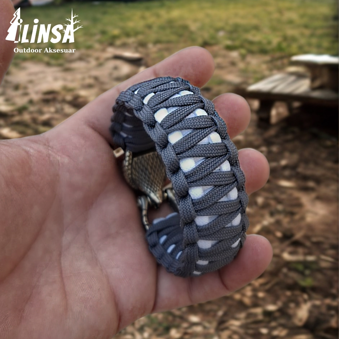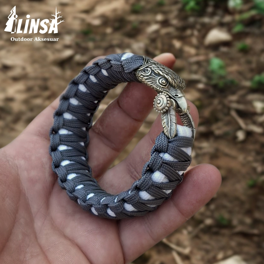 %100 el işçiliği ile üretilen bu bileklik, pirinçten yapılmış özel toka ve dayanıklı Paracord Type III ip ile sadece bir aksesuar değil; maceracı ruhunuzun bir parçası.